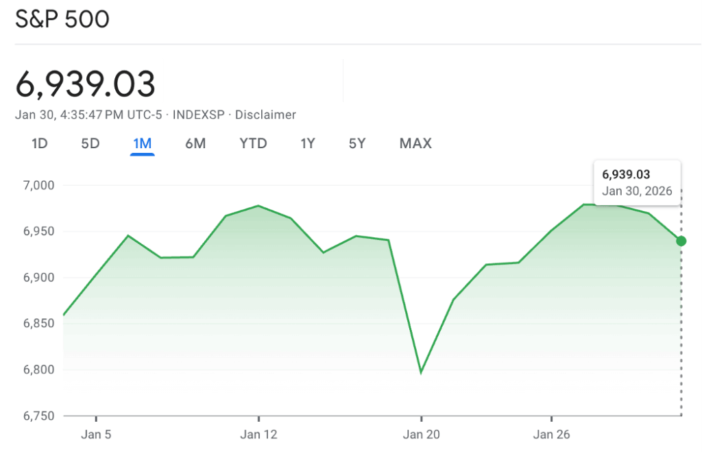The recovery seen in the latter half of the month was supported by a "strategic pause" from the Federal Reserve. During the 28 January meeting, Chair Jerome Powell announced that the Fed would hold the target interest rate steady at 3.50% to 3.75%. This decision, which followed three consecutive rate cuts in late 2025, provided a much-needed sense of stability to the US market. The graph shows the index climbing back toward its previous highs following this announcement. However, the month ended with a final burst of volatility on 30 January after the nomination of Kevin Warsh to succeed Jerome Powell as Fed Chair. This news caused a sharp rise in the US dollar and a "flash crash" in precious metals, which trickled through to equity valuations and caused the slight downward tick at the end of the January 30 trading session.