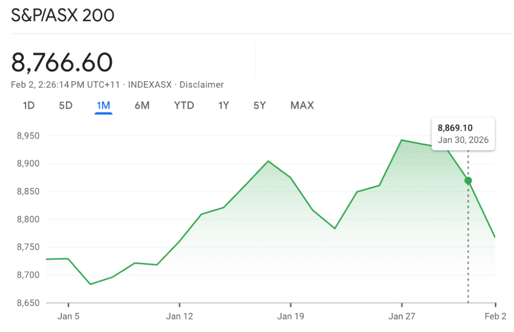 Despite these hawkish signals, the ASX 200 showed remarkable resilience. As the graph indicates, the index didn't just hold its ground; it surged to a peak of 8,869.10 on 30 January, finishing the month with a solid 1.78% gain. This peak was largely the result of a spectacular run in gold and uranium stocks, which acted as a hedge against rising geopolitical tensions. Gold prices soared above $5,000 per ounce for the first time, providing a massive tailwind for local miners like Northern Star Resources and Evolution Mining. However, the month ended on a more sombre note. A sharp pullback in the final sessions of January, visible in the steep decline on the far right of the graph, occurred as traders locked in gains and prepared for the RBA's decision in early February.