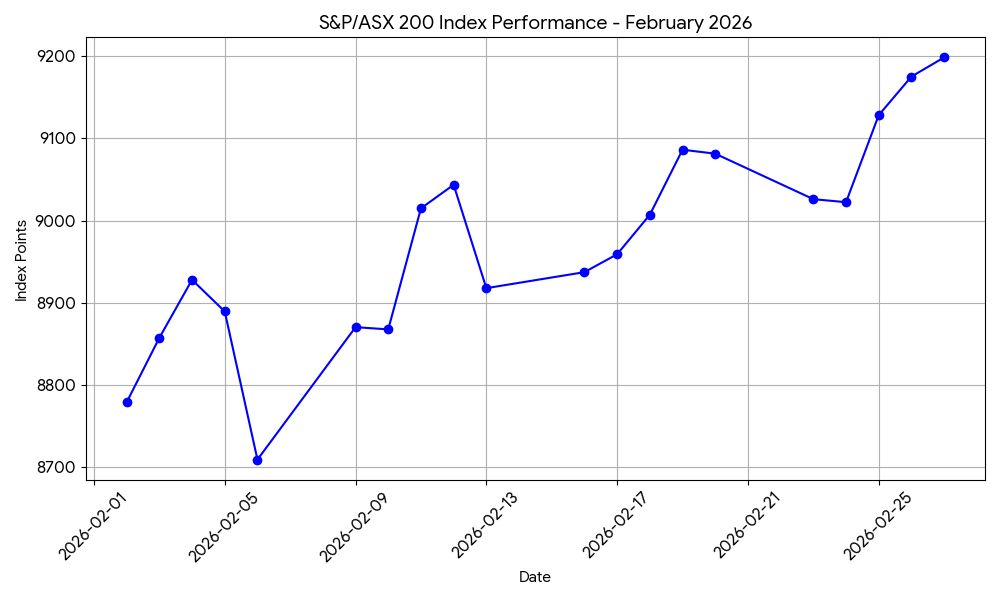 Looking at the first graph below, the S&P/ASX 200 presents a picture of robust and sustained growth, despite a slightly rocky start. The index began February near 8,780 points. Following a sharp, sentiment-driven dip around the 5th of February that pushed the market down to the 8,710 mark, it commenced a relentless upward climb. This trajectory culminated in a record-high finish near 9,200 points, representing a stellar 3.7 percent gain for the month. This exceptional performance was not an accident; it was the direct result of a remarkably strong local reporting season. According to market reporting from IG Australia, heavyweight miners, banks, and consumer staples delivered highly resilient results that aggressively boosted the aggregate index.
