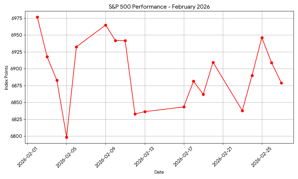 Turning our attention to the second graph above, the S&P 500 illustrates a decidedly more turbulent and ultimately suppressed story. Starting the month on a high near 6,975 points, the index suffered a violent plunge on the 5th of February, bottoming out around 6,798 points. While it attempted several recoveries throughout the month, specifically peaking around the 9th and spiking again on the 25th, it consistently met heavy resistance and finished February lower at approximately 6,878 points. This represents an overall decline of roughly 0.8 percent, a stark contrast to the Australian market's resounding success.
