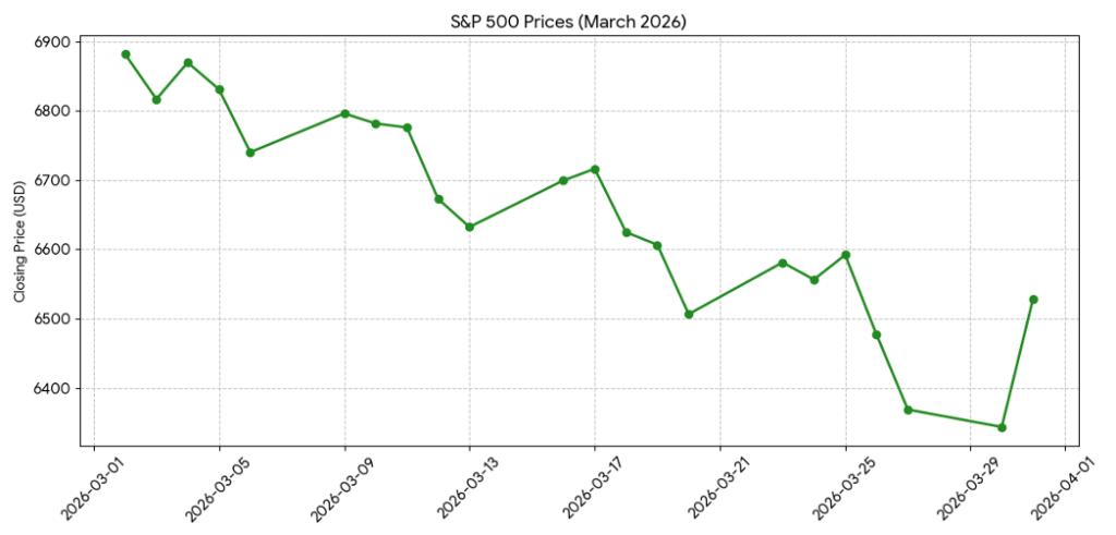 The S&P 500 also trended downward across March, but the path was far less smooth. Instead of a gradual slide, the index moved in sharp bursts — falling, rebounding, and then falling again. By the final week of the month, it reached its lowest point before staging a noticeable bounce right at the end.